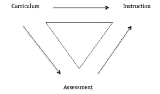 These negative effects of summative tests are compounded in a school managerial setting where the success or otherwise of teachers and/or schools is predicated principally on external summative test results, and which can have a dire effect on teacher and school morale. My colleague, Paul Black, from King’s College, London has devised a visual means of expressing this. He first noted the commonly used CIA–Triangle to symbolize the relationship between curriculum, instruction, and assessment, as in Figure 1.